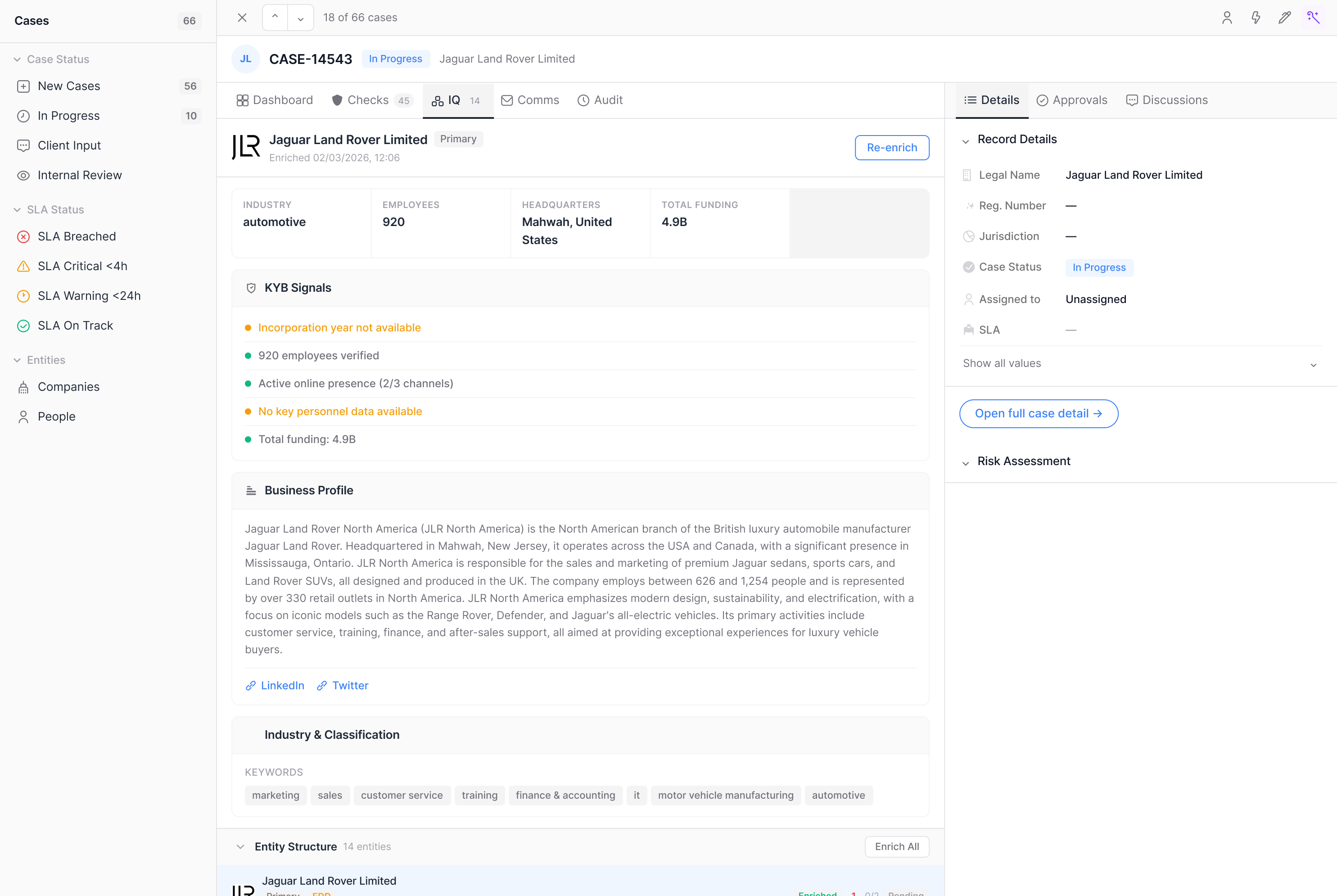 7-status workflow from flag to close with 3 reviewer tiers. Assign, escalate, and resolve cases with full audit trails and SLA tracking built in. Entity hierarchies, UBO trees, and verification tracking in one place.