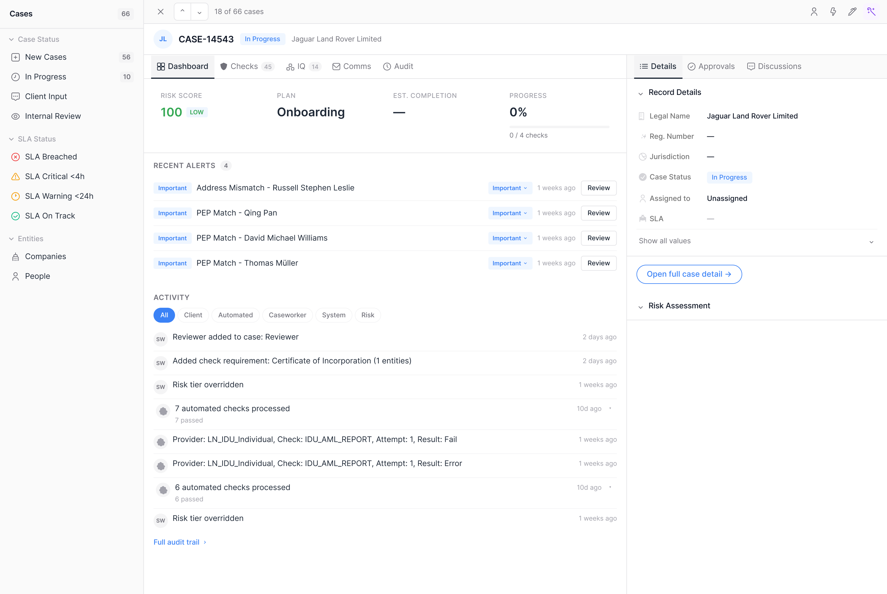 Real-time queue tracking across sanctions, PEP, adverse media, and transaction monitoring. Countdown timers, automatic escalation, and 5 role-based dashboards for CRO, Manager, Officer, CX, and Engine Health. See which cases are on track, at risk, or breached before your regulator does.